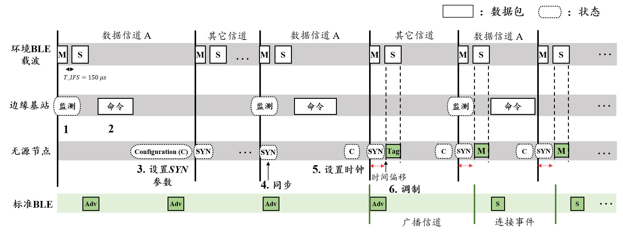 为了更接近商用兼容的愿景,节点应能实现宽带跳频。首先,项目拟采用为节点调制设置动态时钟的方法,通过引入一个哈希表进行时钟切换,节点能够通过施加不同的频移将其激励信号反向散射到动态的蓝牙信道。这种宽带跳频机制可以支持与标准设备的通信。此外,无源节点与标准蓝牙设备的连接建立急需一个规范化的过程。