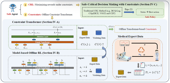 强化学习(RL)在医疗健康领域的一个重要应用是优化治疗决策。然而,原始的RL策略可能导致不安全的医疗决策,例如过量用药或治疗方案的突然改变,这通常是因为智能体未能考虑常识性约束。为了缓解这些问题,约束强化学习(CRL)通过预定义约束条件优化策略,自然成为一种实现更安全决策的有前景方法。将CRL扩展到医疗应用时,一个核心挑战在于如何为不同医疗场景准确设定约束函数。近期出现的逆向约束强化学习(ICRL)是一种从专家示范中推断约束的有效方法。然而,ICRL算法建模的是马尔可夫决策过程,并依赖实时交互环境。这些设定与医疗决策系统的实际需求不符,因为医疗决策依赖于离线数据集中记录的历史治疗信息。针对这些问题,我们提出约束变换器(CT)。具体而言:1)我们采用因果注意力机制将历史决策和观测数据融入约束建模,同时使用非马尔可夫层对加权约束进行关键状态捕捉;2)通过生成式世界模型进行探索性数据增强,使离线RL方法能够模拟不安全决策序列。在多种医疗场景中的实证结果表明,CT能有效识别不安全状态,获得接近更低死亡率的策略,并降低不安全行为的发生概率。